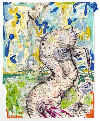 Ballpoint pen, ink, color marker, watercolor and acrylic on paper