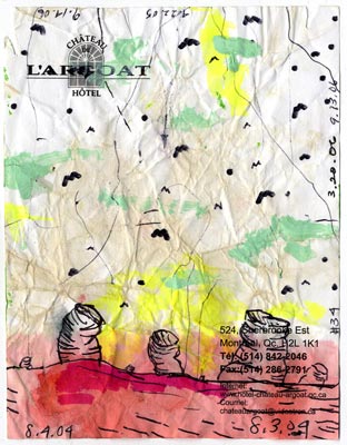 Ink, ballpoint pen, colored marker and acrylic on hotel stationary